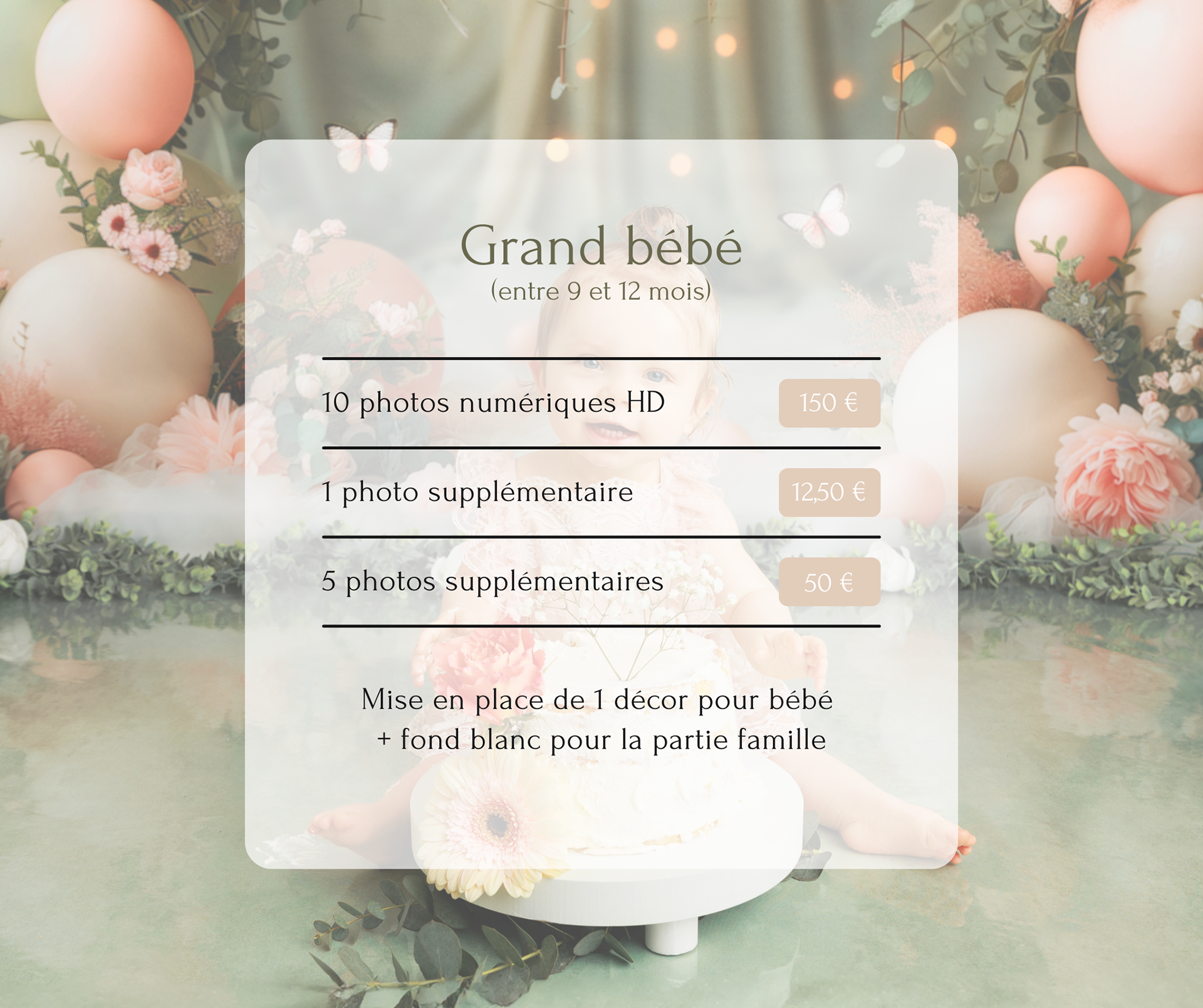 Si vous souhaitez opter pour le type de séance "smash cake", où bébé peut explorer et s'amuser avec un gâteau d'anniversaire, veuillez noter que le gâteau doit être acheté par vos soins. Cela permet d'éviter tout problème d'allergie et de s'assurer que bébé profite pleinement de cette expérience ludique. De plus, il est également possible d'utiliser une bassine avec de l'eau et un peu de lait pour une séance " bain de lait ", une activité que les bébés adorent !
